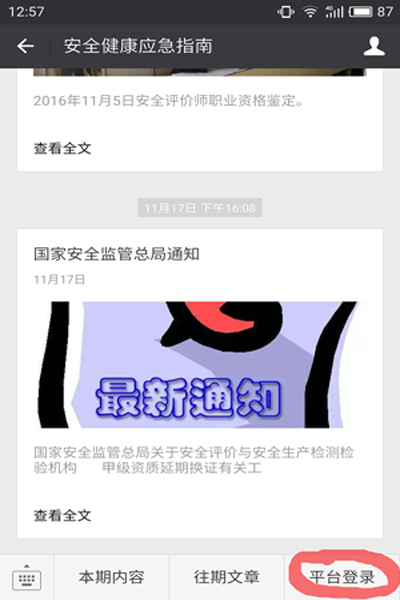 开辟微信公众号定位数据传输通道,其基本功能是:在需要标注的目标周边,用手机将其定位数据(坐标)通过微信公众号通道,直接发送到“安全生产技术服务平台”上已经建立的“地图编辑”栏目中,自动标注在电子地图上。此外还可以使用该通道将标注目标的照片、视频、文档、总平面图、周边情况等资料实时传输到“电子地图”上“详情”栏目。