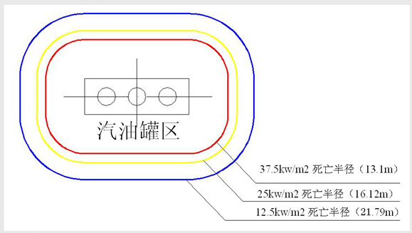 在码头进行易燃液体的装卸、存储生产过程中,有可能发生易燃液体泄漏事故,当大量的液体自储罐泄漏到地面后形成一定厚度的液体池,这时一旦遇到火源,液池将被点燃,发生地面池火灾。池火灾的主要伤害因素是其热辐射对周围人员和设备设施的危害。本案例将易燃液体罐箱划分为一个单元,假定储罐发生泄漏,形成液池且发生池火灾,评价池火灾火焰产生的热辐射对周围人员和设备设施的破坏程度。