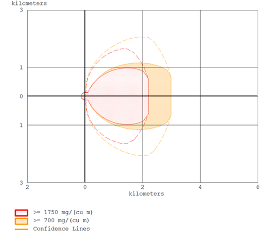 液氨罐一旦破裂,泄漏的液氨会立即蒸发形成蒸气,造成周围环境温度急剧降低,使得周边水蒸气液化形成液滴并进一步溶解氨气后变成重质气雾,需要使用重质气体扩散模拟软件(ALOHA软件)进行模拟计算。若发生稳态泄漏,在漏口附近影响区内,能形成一个稳定的死亡区。