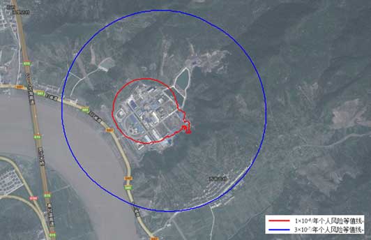 个人风险是指区域内的不同危险源产生在区域内某一固定位置的人员的个体死亡概率。个人风险体现为区域地理图上的风险等值线。对危险化学品生产、储存装置进行风险计算,分别确定各点个人风险的大小,再将风险值为同一数量级的各点联接成线,这样就形成了一条条互不相交的闭合曲线。